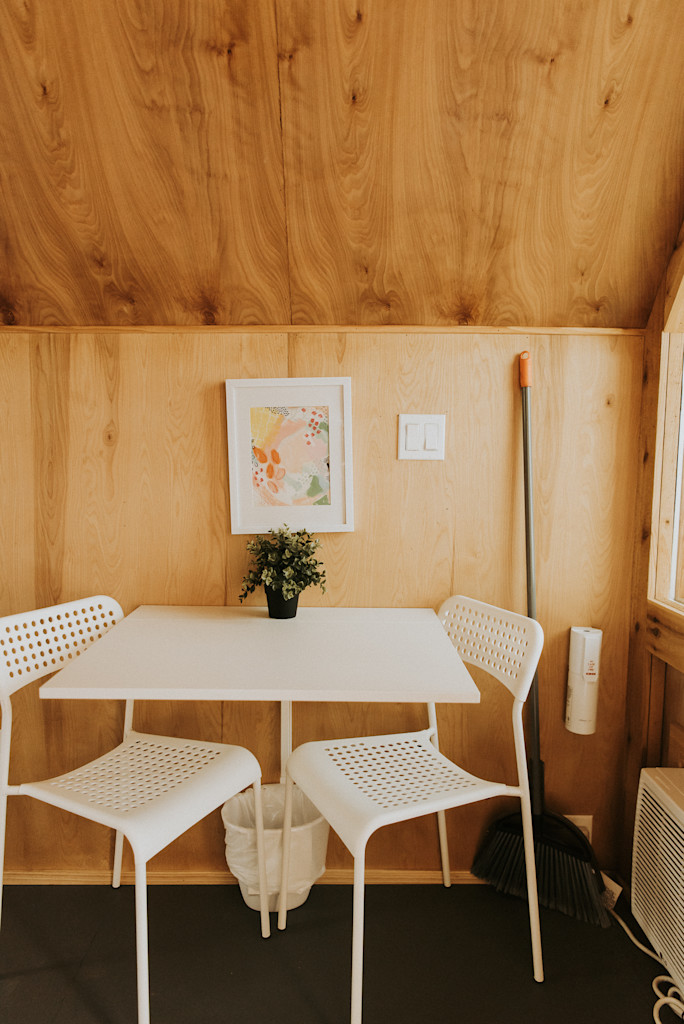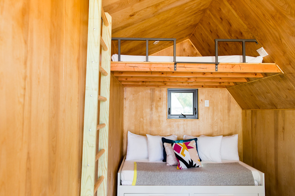 The interior dimensions are approximately 7’x11’ (about 77 sq. ft.) With space inside being at a premium, we opted for IKEA’s functionally-designed furniture. The main bed is a daybed that pulls out into a comfy king bed, and the loft is a full bed. The ladder for the loft detaches and can be hung out of the way on the wall. There’s a small interior table that folds down too. We wanted guests to spend most of their time outside, but have a comfortable interior space for colder days.